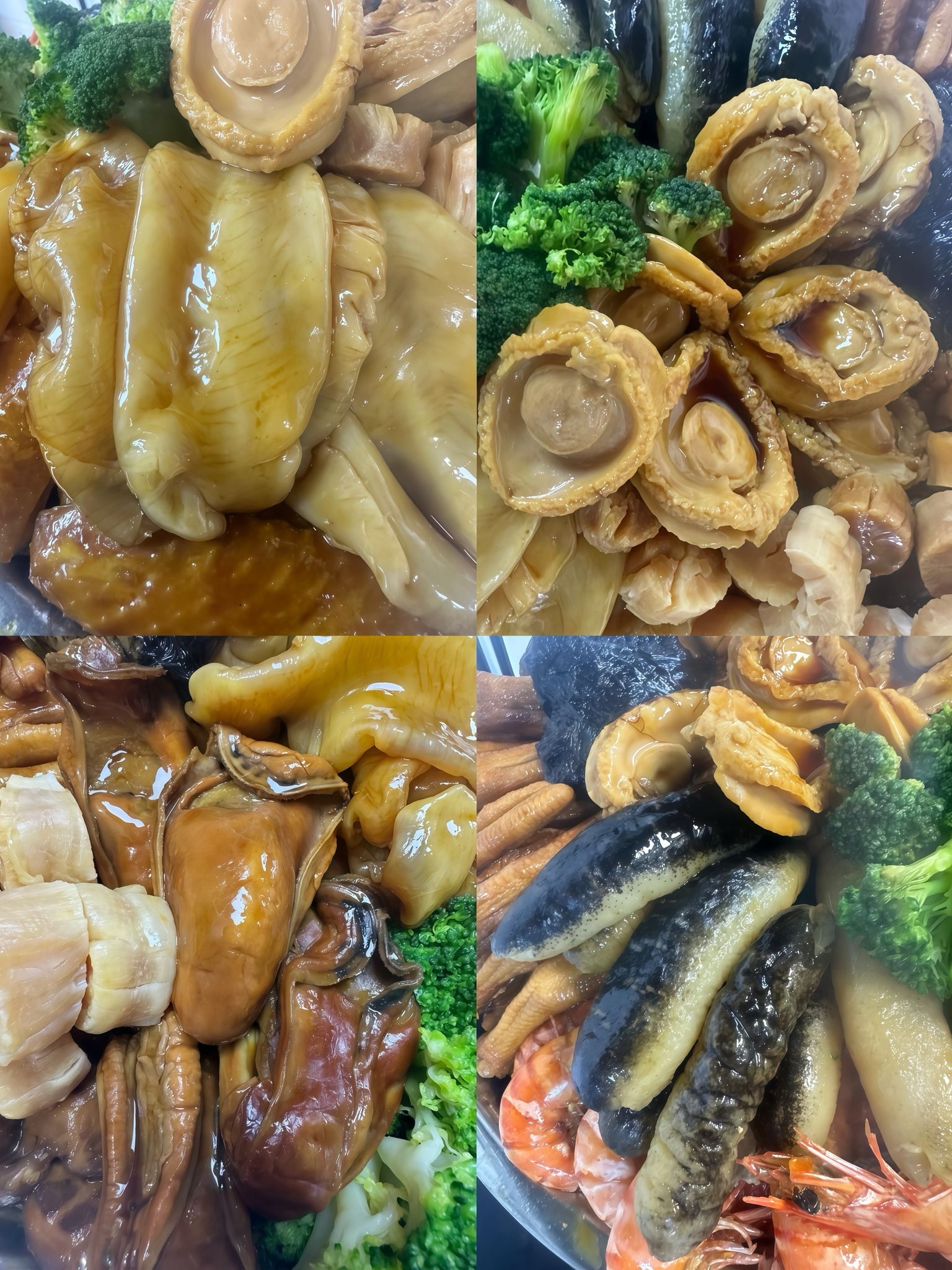 金蠔、海參、鮑魚、花膠、元貝、蝦、雞、燒鴨、髮菜、花菇、鴨掌、豬皮、魚蛋、西蘭花、枝竹、蘿蔔、芋頭、蓮藕、旺菜